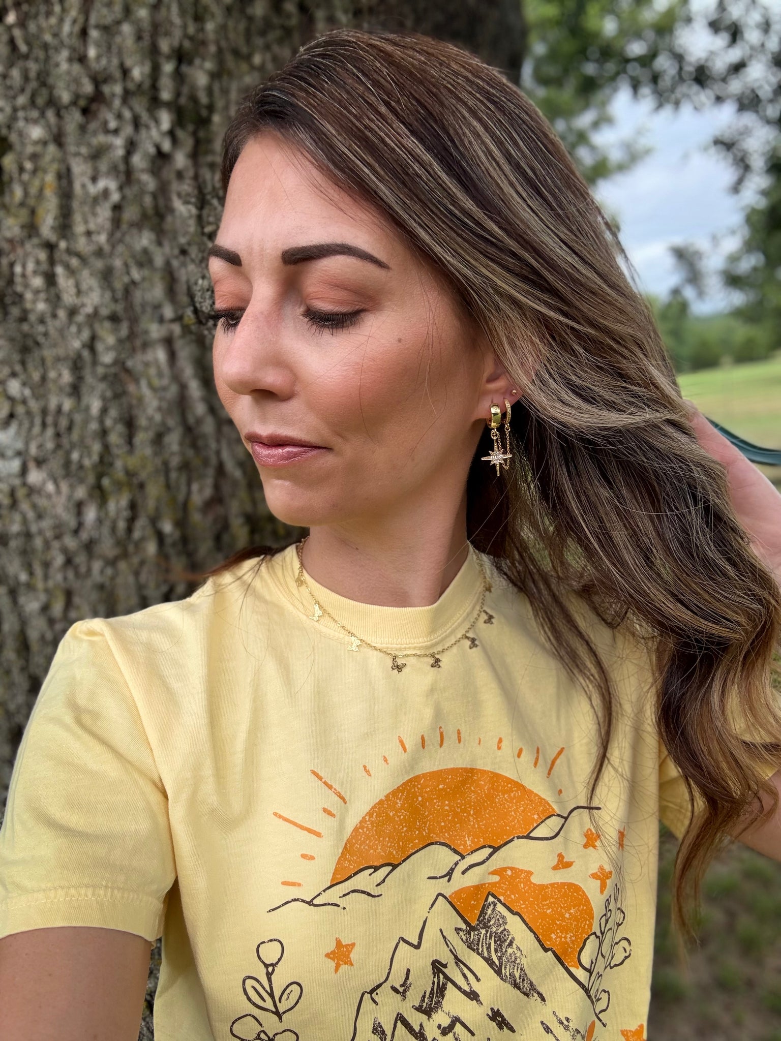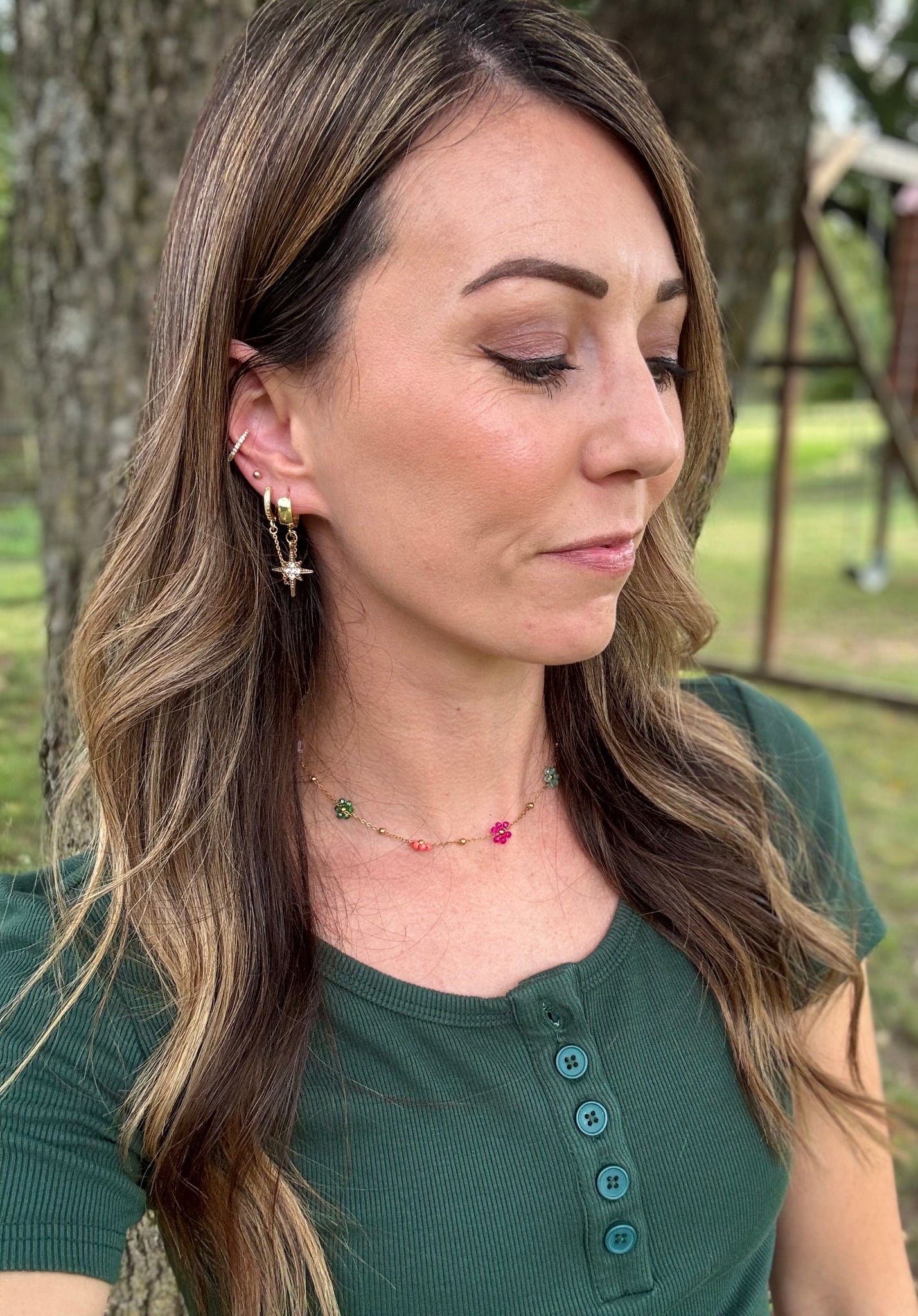 18 k gold with double huggie hoops, chain and starburst charms! These are must haves!
